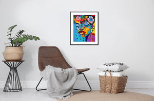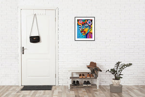 This painting comes framed with a double white mat, black metal frame, and tempered glass glazing.