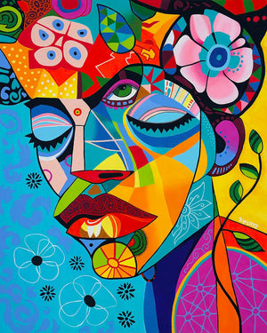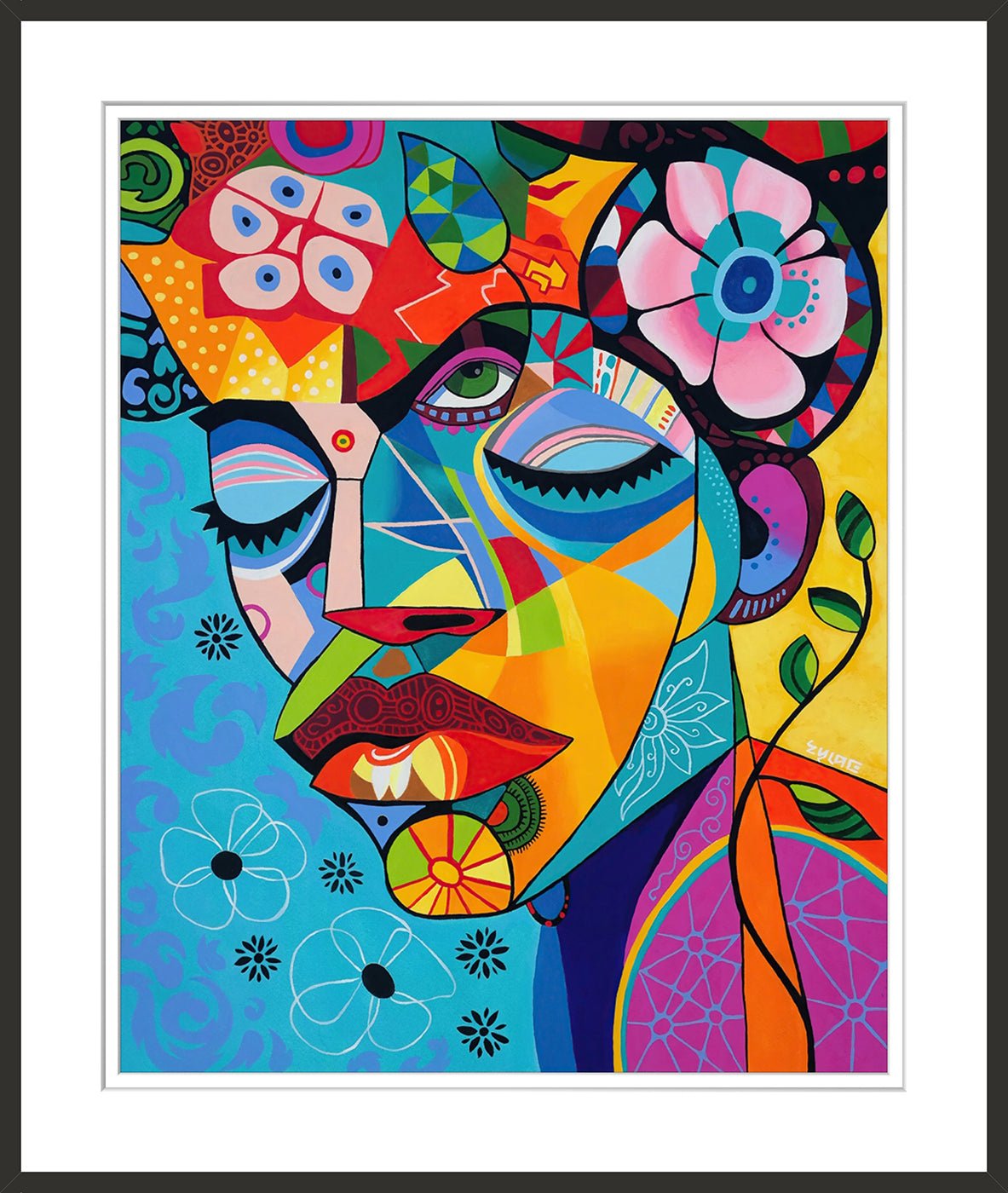 The figure in the painting appears to be in a peaceful and meditative state. Both eyes are closed, but a third open weary eye keeps watch. Flowers and vines in the painting represent growth and healing.